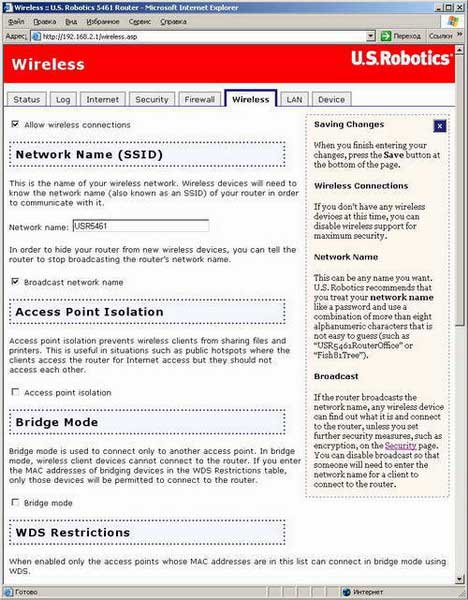 Приятно видеть, что появляющееся в последнее время беспроводное оборудование не только использует технологии увеличения скорости работы, но и новые протоколы защиты. Так, на USR 5461 можно воспользоваться практически любым протоколом, начиная от WEP и заканчивая современным WPA2, использующим шифрование AES.