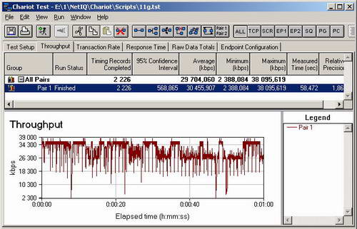 Естественно, первым тестом устройства, носящего название маршрутизатор, был тест скорости маршрутизации. Для внутреннего интерфейса остался стандартный адрес по умолчанию 192.168.2.1, для внешнего - 192.168.1.1, маска 255.255.255.0. Адреса из соответствующих сетей были присвоены и компьютерам. На обоих компьютерах были запущены конечные точки системы тестирования, кроме того, на одном из них была запущена тестовая консоль – NetIQ Chariot.